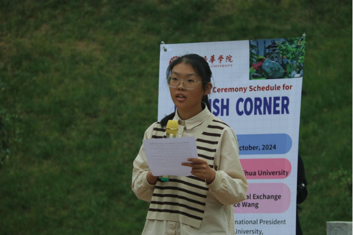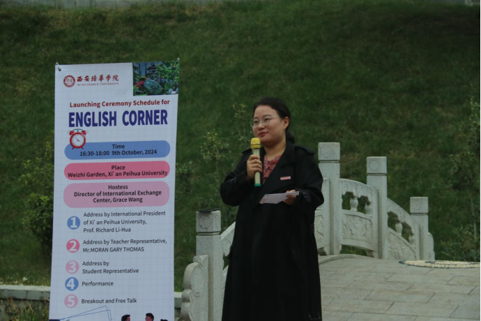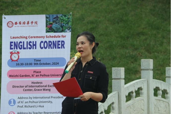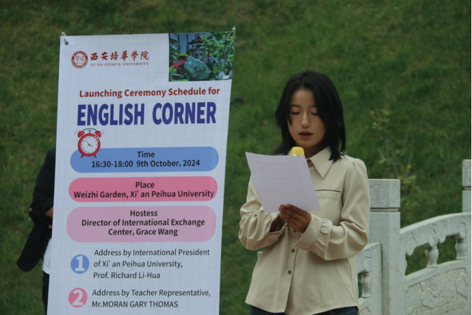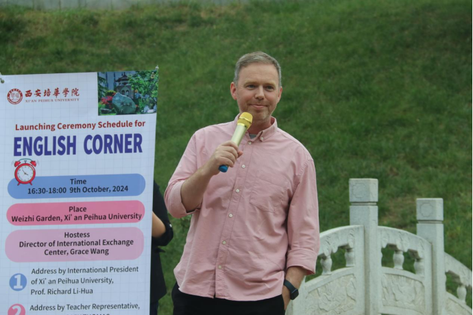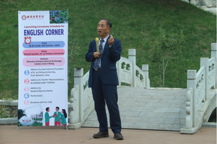 In the golden autumn of October,the heady fragrance of laurel blossoms waswafted through the fresh air.On the afternoon of October 9th, Professor Li Hua, International President of Xi'an Peihua University, Wang Peng, Director of the International Exchange Center of Xi'an Peihua University, Liu Gailin, Deputy Director of the Academic Affairs Management Center, MoranGaryThomas, a foreign teacherofXi'an Peihua University, along with representatives of teachers and students from the Elite Class, gathered together to witness a significant event aimed at stimulating enthusiasm for English learning and enhancing cultural exchanges—the launching ceremonyof the "English Corner".Theceremonywas hosted by Wang Peng, Director of the International Exchange CenterofXi'an Peihua University. She welcomed the students participating in the event and introduced that the purpose of this activity was to provide a platform for students to practice their spoken English and broaden their international horizons, thereby further promoting the internationalization process of theschool.