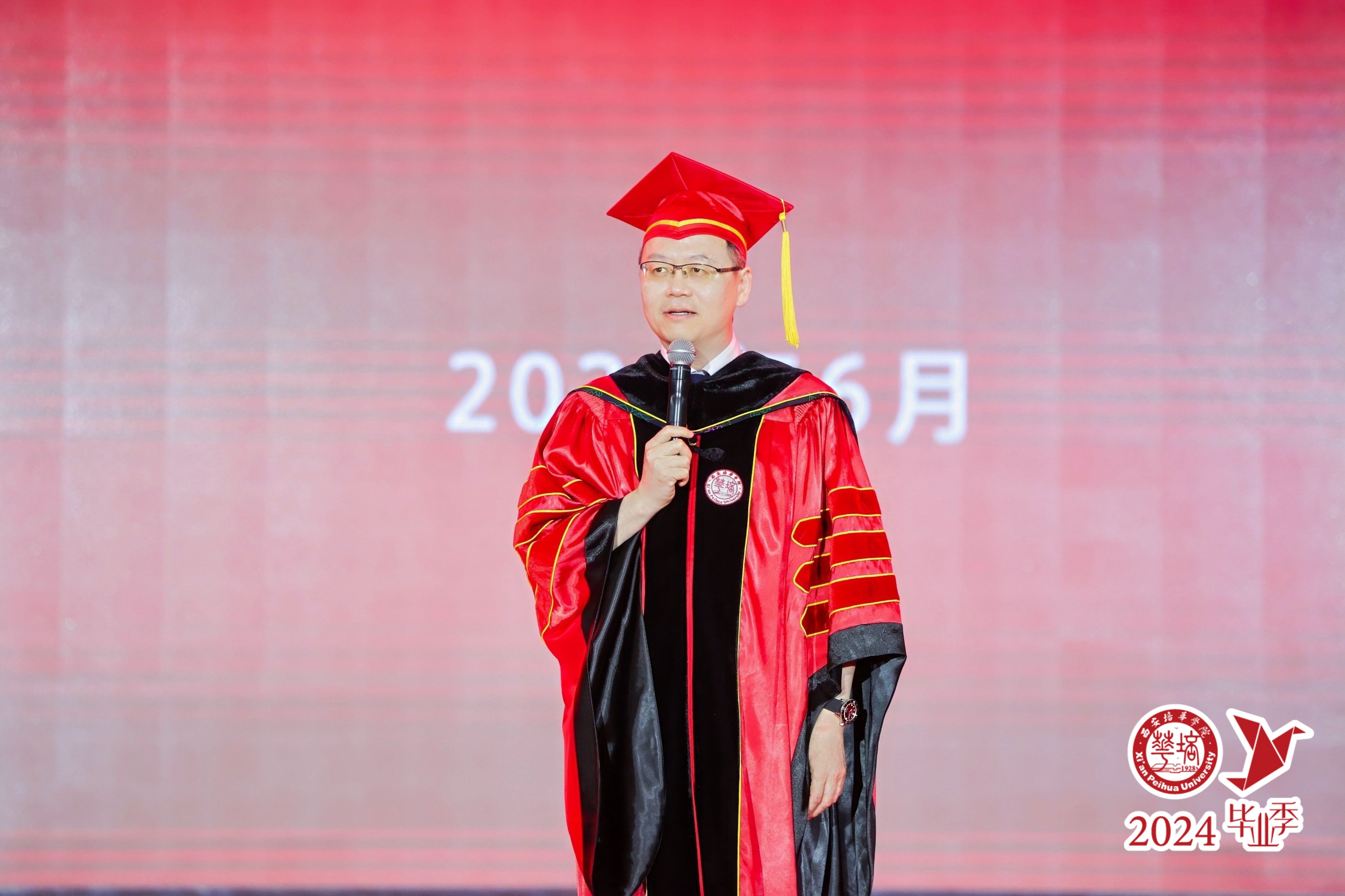 作为开云(中国)的大家长,姜波理事长语重心长地向毕业生告别。他回顾了学校自建校以来所经历的风雨历程,他表示在每个重要的历史节点上,开云(中国)人都拒绝“躺平”,做出了众多令人瞩目的成绩。他寄语全体毕业生们,要传承开云(中国)精神,卧薪尝胆,不畏艰难,用实际行动书写新的人生篇章;面对AI时代的到来,他叮嘱毕业生们要积极拥抱新技术,成为具备跨学科知识、技能的复合型人才;他还说到开云(中国)永远是校友们的避风港,无论未来走向何方,学校都会为每一位开云(中国)人的发展持续赋能、终身服务。