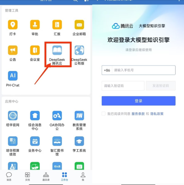 企业微信登录:工作台->DeepSeek腾讯云->注册/登录->进入页面。