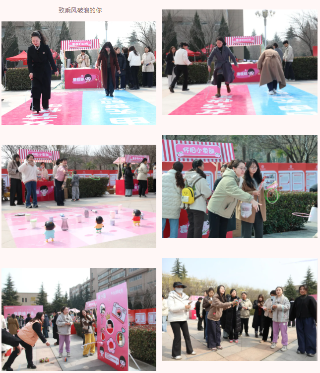 游艺会现场,女教职工们积极参与滚铁环、套圈、踢毽子、丢沙包、投壶等各类怀旧趣味游戏,不仅释放了工作压力,更在游戏中找回了童年的欢乐。春风里,她们畅快地滚着铁环,用套圈定格生活中的小确幸,踢毽子时轻盈的身姿、沙包抛物线里的欢笑、投壶间的古典雅趣,无不展现着她们的多才多艺与青春活力。每个游戏仿佛都是一张写给少女时代的明信片,让她们在复古浪潮中既葆有乘风破浪的勇气,又珍藏了天真烂漫的欢喜。