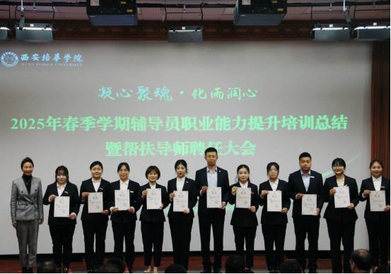 各二级学院书记为新入职辅导员颁发结业证书并赠送工作寄语纪念卡。帮扶导师为新入职辅导员佩戴了校徽并赠送了入职大礼包。