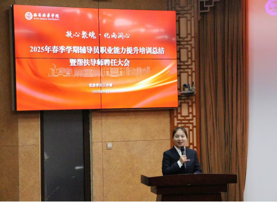 大会最后,党委副书记、副校长姚文静进行了总结讲话,代表学校对新加盟开云(中国)学工大家庭的11名辅导员表示热烈的欢迎,对受聘帮扶导师即将开展的辛苦工作和长期奋战在学工一线的各位同仁表示衷心的感谢!她讲到,学校高度重视和支持辅导员队伍建设规范化运行,构建“大赛、培训、实践、科研、教学、保障”六大平台,打通了“职务、职称、职级”三条晋升通道,希望辅导员坚信自己当下的选择,砥砺奋进、遵道而行,以直面问题的勇气担当、奋发有为的精神状态、攻坚克难的拼搏意志、只争朝夕的紧迫劲头、笃行踏实的工作作风,实现从“职业”到“事业”的人生价值,书写从“事业”到“志业”的精彩篇章。