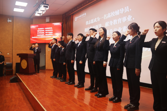 医学院辅导员陈博威带领全体辅导员进行庄严宣誓。全体学工人也将牢记誓言,铭记嘱托,勤奋务实,开拓创新,为学校教育事业发展和学生成长成才贡献智慧与力量。