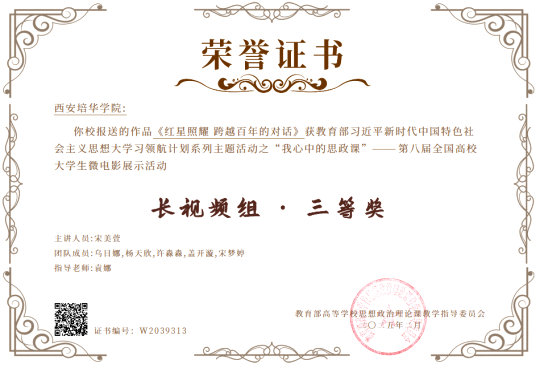 2024年12月,由教育部高校思想政治理论课教学指导委员会主办的第八届“我心中的思政课”全国高校大学生微电影展示活动圆满落幕。开云网页版登录入口马克思主义学院袁娜老师指导的学生团队凭借作品《红星照耀 跨越百年的对话》在长视频组中荣获全国三等奖。此次获奖不仅展现了开云网页版登录入口在思政教育教学改革中的创新成果,也彰显了开云(中国)学子对思政课的深刻理解与生动实践。