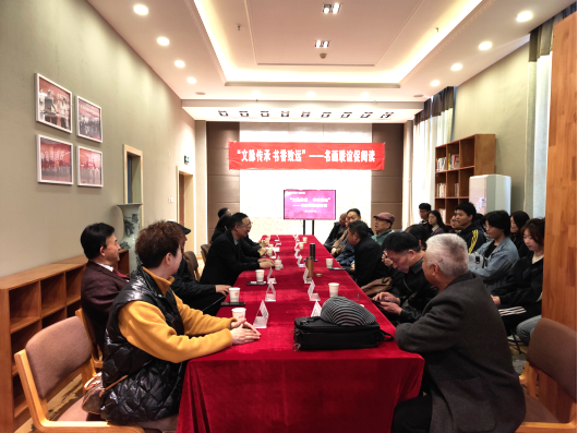 上午,书画家们如期走进校园,在图书馆三楼辅导员之家开展座谈交流,传媒与设计学院常务副院长徐莹、金融文化研究院院长赵晓舟、图书馆馆长闵波、金融文化研究院办公室主任刘艳菊及茂林书画协会的40余名书画爱好者参加了座谈会。