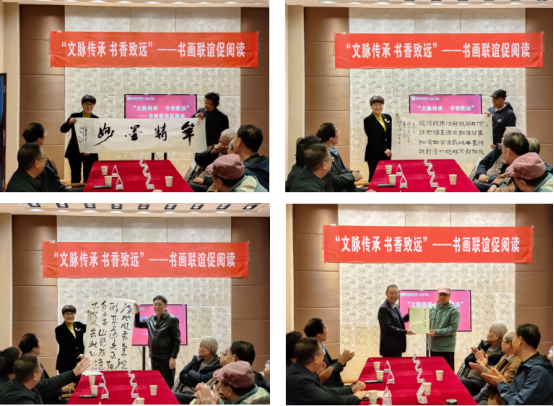 会上,西安市诗书画研究会会长傅晓鸣,陕西省书画艺术研究院副院长康小强,陕西金融书画协会常务副主席兼秘书长李润定,陕西金融书画协会副主席庞少波,陕西金融书画家协会主席、西安市美术家协会副主席舒宏昌分别向学校赠送了自己的书画作品和作品集。