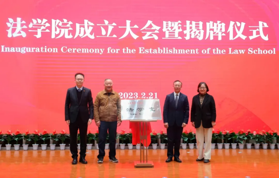 著名法学家,第十三届全国人民代表大会宪法和法律委员会副主任委员、最高人民法院原党组副书记、副院长,二级大法官江必新教授(右二),陕西省第十届人大常委会副主任邓理(左二),陕西省高级人民法院审判委员会专职委员赵学玲(右一),开云网页版登录入口理事长姜波(左一)共同为法学院揭牌