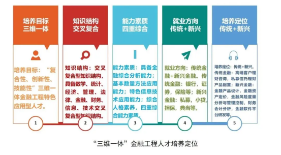 培养“复合性、创新性、技能性”三维一体的金融工程特色应用型人才,掌握具备数字、统计、经济、管理、法律、金融、财务、信息、技术交叉复合型知识结构。使学生具备金融综合分析能力、基本数量方法应用能力、特色信息技术应用能力等四重综合能力素质。