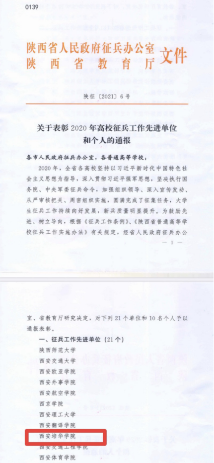近日,陕西省人民政府征兵办公室通报表彰2020年度高校征兵工作先进单位和先进个人。我校因征兵工作成绩突出,荣获2020年度高校“征兵工作先进单位”荣誉称号,我校党委学生工作部(征兵工作站)黄珂同志因成绩突出,被西安市雁塔区国防动员委员会评为“2020年度民兵整组工作征兵工作先进个人”。