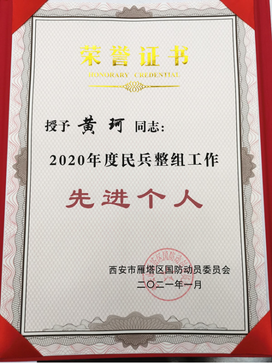 我校党委学生工作部(征兵工作站)黄珂同志被西安市雁塔区国防动员委员会评为“2020年度民兵整组工作征兵工作先进个人”