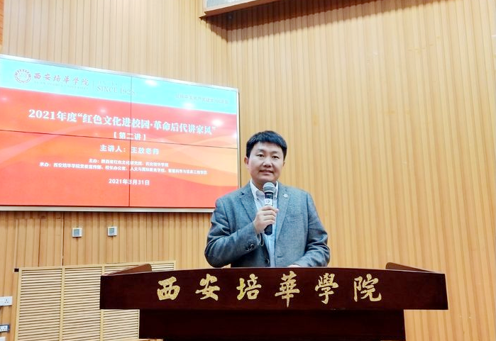 王放老师满怀深情地讲述了自己家庭的红色革命故事,生动再现革命烈士不朽的事迹,动情抒发对烈士们的深切缅怀,回顾了中国人民为祖国伟大事业而奋不顾身的历史事实,讴歌了革命烈士在抗战中表现出来的伟大民族精神。两个小时的报告会上,王放老师讲述了上世纪三十年代父辈走进“安吴青训班”坚定跟着共产党踏上革命道路、参加“西安事变”、抗日战争、解放战争、抗美援朝和社会主义建设光辉岁月;讲述了相爱于烽火硝烟、同甘共苦相濡以沫五十七年之久的父母爱情故事;讲述了良好红色家风的传承以及自己不忘父辈重托,倾其所有创立红色文化传播团队,不忘初心,牢记使命,带领大家全身心地传播宣讲红色文化,传承讲好红色家风故事,打造出红色文化品牌的感人经历。