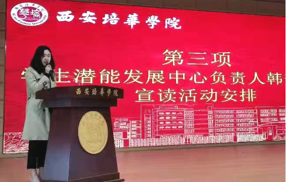 学生潜能发展中心负责人韩赟老师宣读第二十三届心理健康节暨生涯规划主题活动安排。学校以“3.25”善爱我、“5.25”我爱我为契机,将持续开展一系列内容丰富、形式多样、具有实际意义和实效的心理健康教育及生涯规划。
