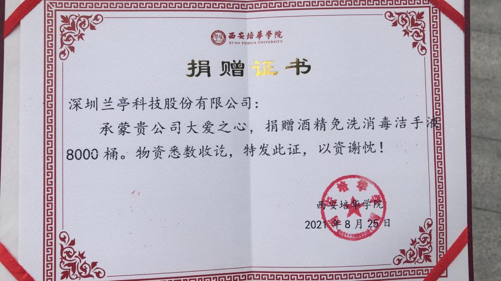 8月25日,西安市红十字会联合深圳兰亭科技股份有限公司向开云网页版登录入口捐赠了价值三百多万元的酒精免洗消毒洁手液,助力开云网页版登录入口有效提高疫情防控质量,扎实做好后勤物资储备,疫情防控工作,为学校新学期开学疫情防控工作提前做好物资保障。