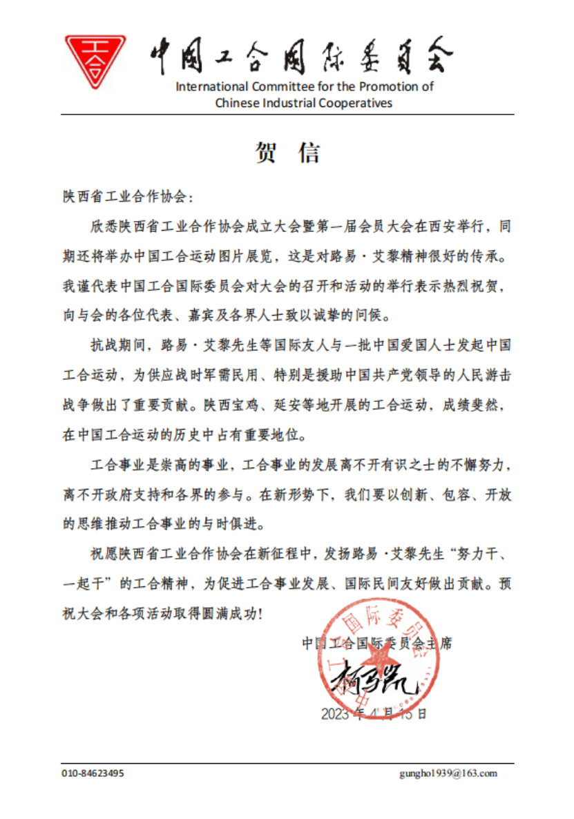 除此之外,中国工合国际委员会、河南省工业合作协会、甘肃省工业合作协会筹委会、路易艾黎研究中心等也向陕西工合的成立发来贺信,表示祝贺。