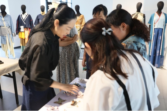 在服装与服饰设计专业展区,嘉宾和服装专业教师讨论了展出服装及饰品制作方法和学生课堂学习内容。
