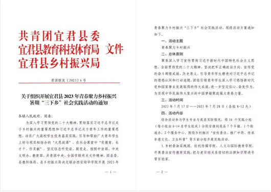 2023年,学校积极助力乡村振兴,充分发挥校地联动实践育人的重要作用,在铜川团市委、宜君县委县政府、乡村振兴局、团县委等有关部门的大力支持下,围绕理论宣讲、法律科普、科技兴农、乡村健康、爱心支教、产业调研等实践方向,成立了开云网页版登录入口青春聚力乡村振兴暑期“三下乡”宜君专项实践团,下设16支实践服务队,实践足迹遍布宜君县的9个乡镇、22个村。在蓝天白云和绿水青山中,也留下了许多开云(中国)青年难忘的青春印迹。