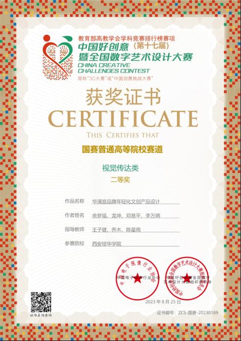 余梦瑶、龙坤、邓意平、李万炳作品《华清宫品牌年轻化文创产品设计》获国赛二等奖