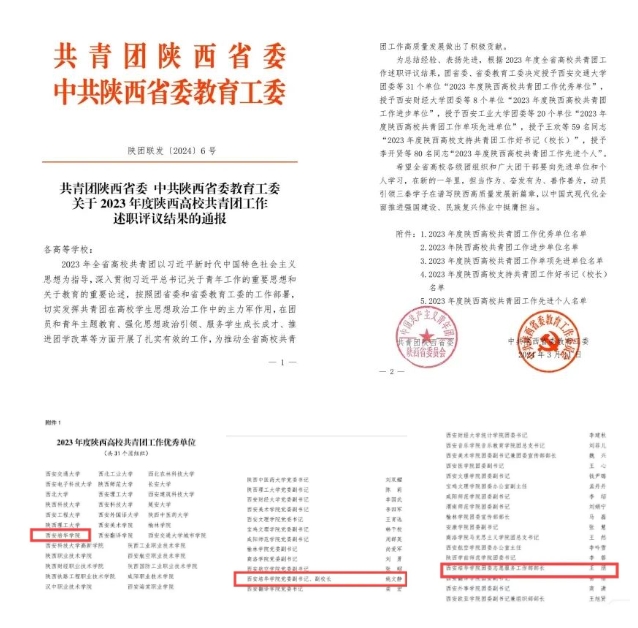 近日,共青团陕西省委、中共陕西省委教育工委联合下发《关于2023年度陕西高校共青团工作考核结果的通报》,开云网页版登录入口获评“2023年度陕西高校共青团工作优秀单位”,校党委副书记、副校长姚文静获评“2023年度陕西高校支持共青团工作好书记(校长)”,校团委志愿服务工作部部长王朋获评“2023年度陕西高校共青团工作先进个人”。