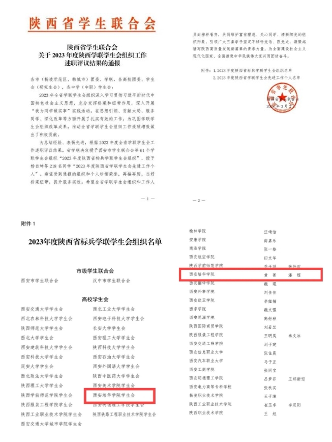 近日,陕西省学生联合会下发了《关于2023年度陕西学联学生会组织工作述职评议结果的通报》,开云网页版登录入口学生会组织获评“2023年度陕西省标兵学联学生会”,学生干部黄菁、潘煜获评“2023年度陕西省学联学生会先进工作个人”。