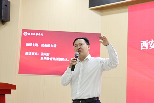 世华教育集团创始人、董事长姜岚昕以《使命的力量》为主题,为现场师生带来了一场精彩的公益演讲。姜岚昕结合自身创业历程与教育实践,深刻阐释了使命对于个人成长、企业发展以及社会进步的重要价值,其深邃的思想、生动的案例引发了在场听众的强烈共鸣,激励着师生们以使命为引领,勇担时代责任。