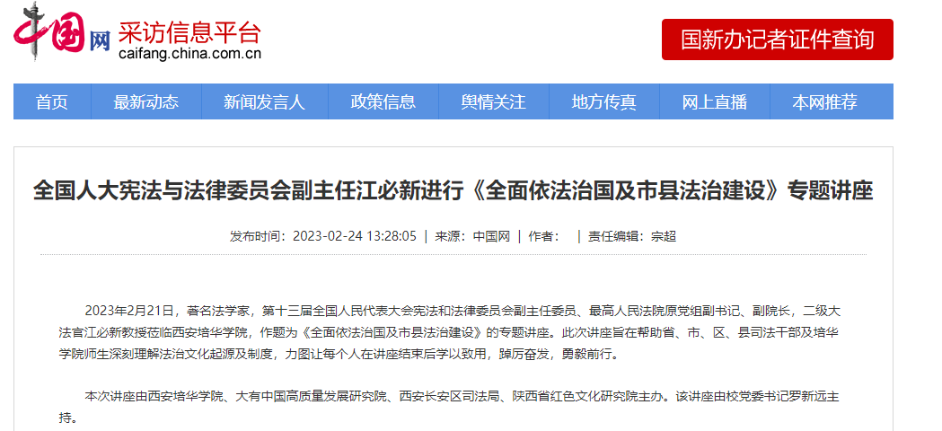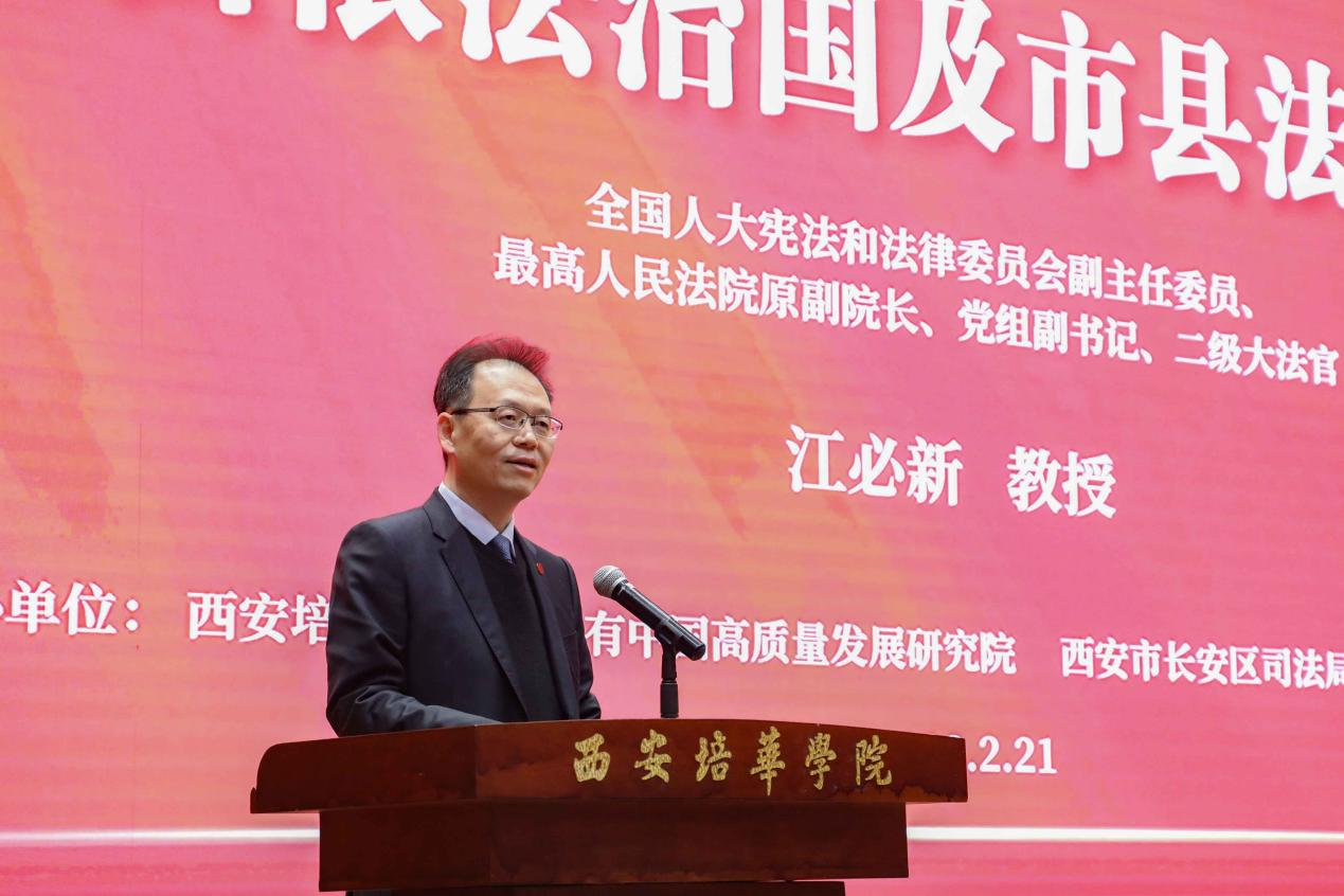 2023年2月21日,著名法学家,第十三届全国人民代表大会宪法和法律委员会副主任委员、最高人民法院原党组副书记、副院长,二级大法官江必新教授莅临开云网页版登录入口,作题为《全面依法治国及市县法治建设》的专题讲座。此次讲座旨在帮助省、市、区、县司法干部及开云(中国)学院师生深刻理解法治文化起源及制度,力图让每个人在讲座结束后学以致用,踔厉奋发,勇毅前行。
