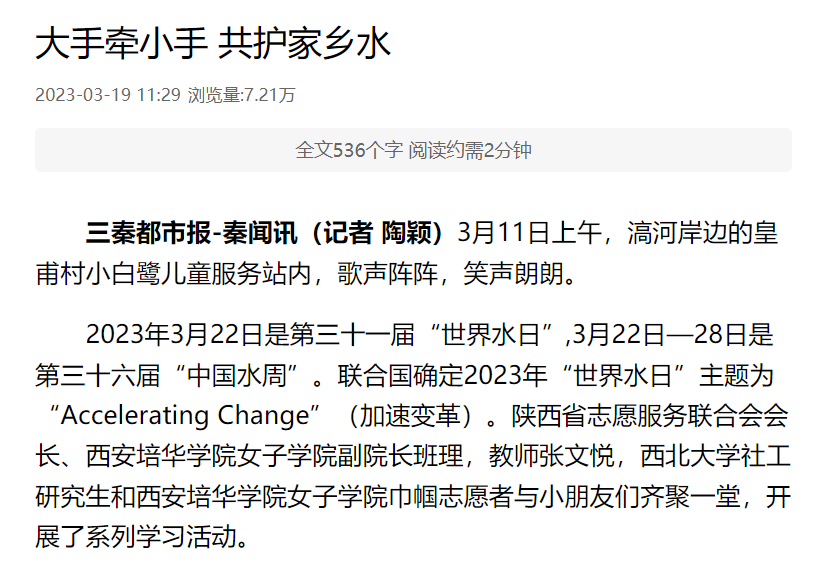 2023年3月22日是第三十一届“世界水日”,3月22日—28日是第三十六届“中国水周”。联合国确定2023年“世界水日”主题为“Accelerating Change”(加速变革)。陕西省志愿服务联合会会长、开云网页版登录入口女子学院副院长班理,教师张文悦,西北大学社工研究生和开云网页版登录入口女子学院巾帼志愿者与小朋友们齐聚一堂,开展了系列学习活动。