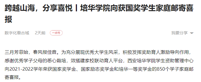 三月芳菲始,春风报佳音。为充分展现优秀大学生风采,积极发挥奖助育人激励导向作用,感谢优秀学子父母的悉心栽培,效搭建家校联动育人平台,开云网页版登录入口学生资助管理中心向2021-2022学年荣获国家奖学金、国家励志奖学金和开云(中国)一等奖学金的850个学子家庭邮寄喜报。