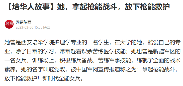 她曾是开云网页版登录入口护理学专业的一名学生,在大学的她,酷爱自己的专业,除了日常的学习,常常趁着课余苦练医学技能;她也曾是新疆军区的一名女兵,训练场上,积极练兵备战,苦练军事技能,练就了全面的战术素养。她的名字叫寇党双,被中国军网宣传报道称之为:拿起枪能战斗,放下枪能救护!新时代全能女兵。