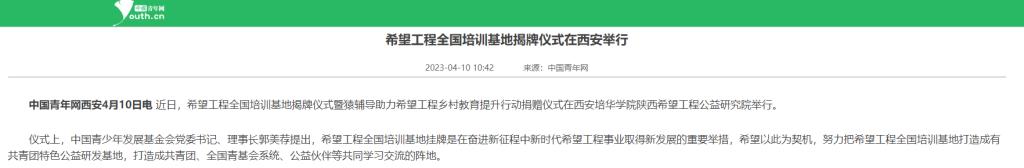 共青团陕西省委书记、陕西省青联主席徐永胜表示:希望工程全国培训基地落户陕西,是对陕西共青团工作的肯定,我们将以培训基地成立为契机,肩负起“共青团要把希望工程这项事业办得更好,努力为青少年提供新助力、播种新希望”使命责任,始终坚持“助力服务青少年公益事业健康发展”理念,持续提升“三力一度”,努力把基地打造成为培养新时代希望工程人才队伍的基地和摇篮。