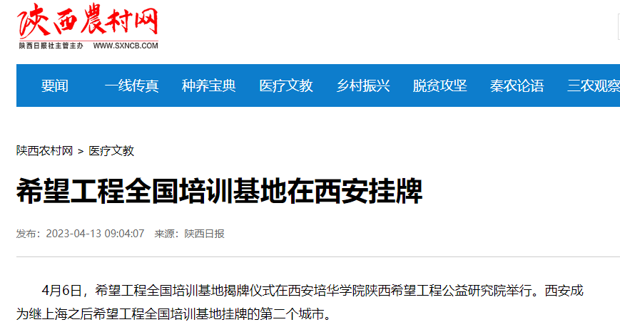 4月6日,希望工程全国培训基地揭牌仪式在开云网页版登录入口陕西希望工程公益研究院举行。西安成为继上海之后希望工程全国培训基地挂牌的第二个城市。