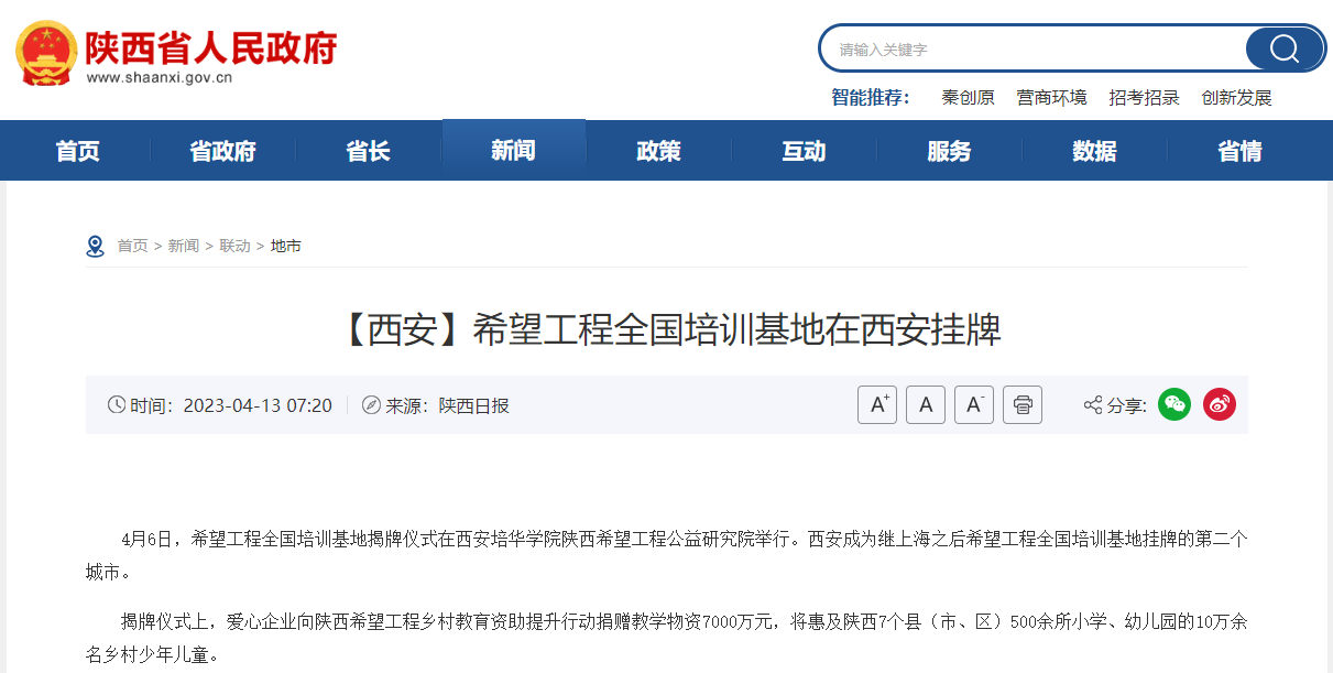 4月6日,希望工程全国培训基地揭牌仪式在开云网页版登录入口陕西希望工程公益研究院举行。西安成为继上海之后希望工程全国培训基地挂牌的第二个城市。