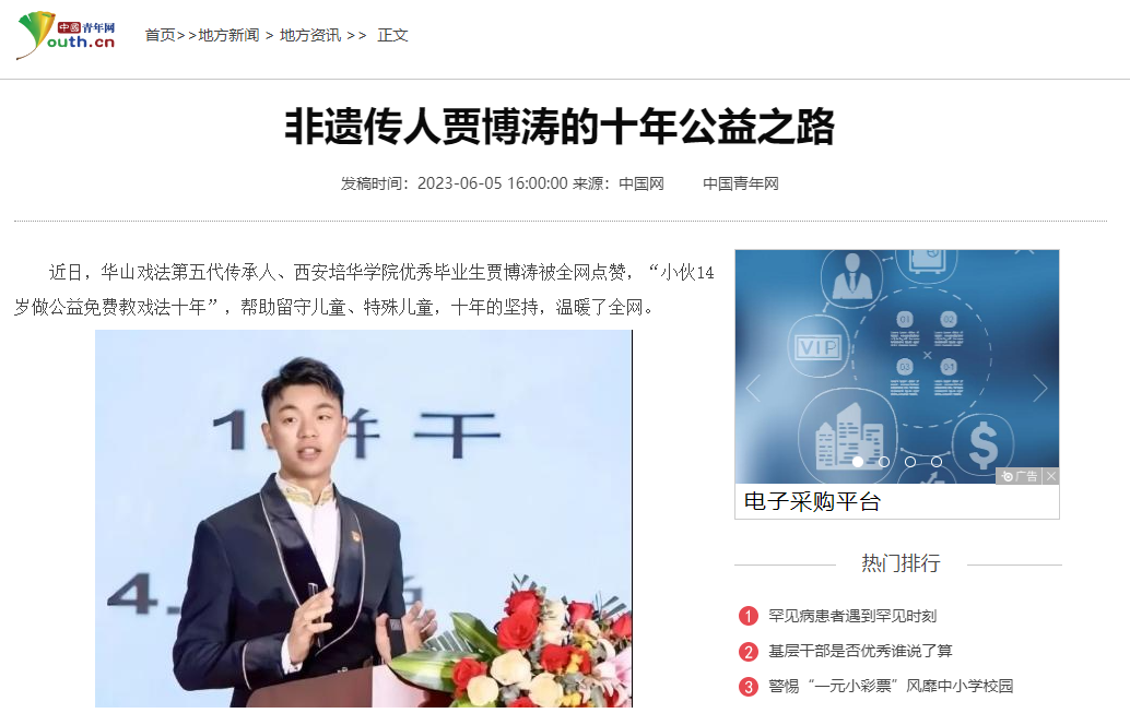 贾博涛自14岁开始做志愿者,8年来累计志愿服务时长4100余小时,志愿服务390余场次,数年来,他用自己的奖学金资助留守儿童、残疾儿童学习非物质文化遗产。