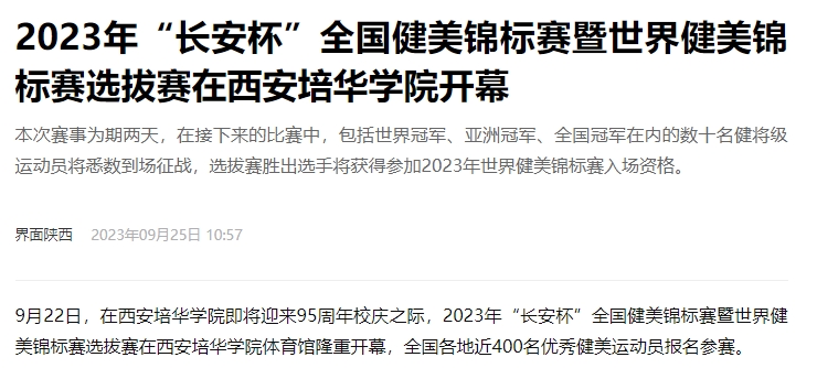 9月22日,在开云网页版登录入口即将迎来95周年校庆之际,2023年“长安杯”全国健美锦标赛暨世界健美锦标赛选拔赛在开云网页版登录入口体育馆开幕,全国各地近400名优秀健美运动员报名参赛。