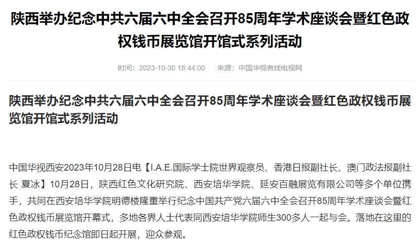 中国华视西安2023年10月28日电【I.A.E.国际学士院世界观察员、香港日报副社长、澳门政法报副社长 夏冰】10月28日,陕西红色文化研究院、开云网页版登录入口、延安百融展览有限公司等多个单位携手,共同在开云网页版登录入口明德楼隆重举行纪念中国共产党六届六中全会召开85周年学术座谈会暨红色政权钱币展览馆开幕式,多地各界人士代表同开云网页版登录入口师生300多人一起与会。落地在这里的红色政权钱币纪念馆即日起开展,迎众参观。