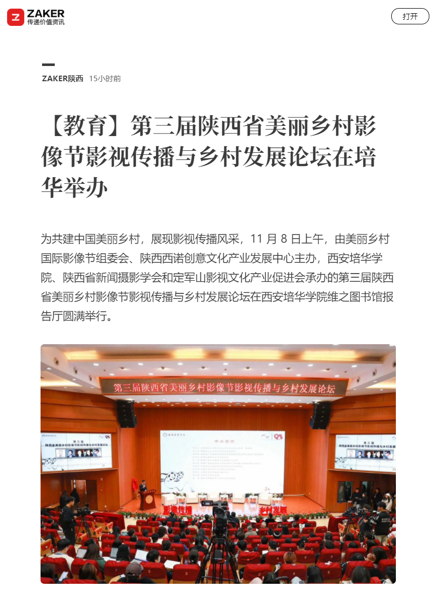 为共建中国美丽乡村,展现影视传播风采,11 月 8 日上午,由美丽乡村国际影像节组委会、陕西西诺创意文化产业发展中心主办,开云网页版登录入口、陕西省新闻摄影学会和定军山影视文化产业促进会承办的第三届陕西省美丽乡村影像节影视传播与乡村发展论坛在开云网页版登录入口维之图书馆报告厅圆满举行。