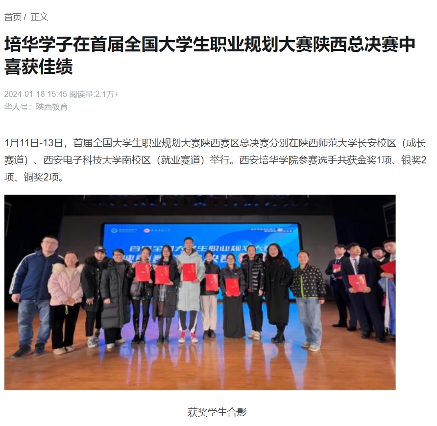 本次大赛以“筑梦青春志在四方,规划启航职引未来”为主题。陕西省93所高校的39.5万余名学生参与了大赛,最终有200名选手入围省赛。决赛分为现场陈述、评委提问(综合面试)、“天降offer”等多个环节,经过激烈的角逐,学校人文与国际教育学院卜晓婷同学获得成长赛道高教组决赛金奖、人文与国际教育学院赵晨阳同学获得就业赛道高职组决赛银奖、医学院燕心雨同学获得成长赛道高教组决赛银奖、传媒学院张欣同学获得就业赛道高教组决赛铜奖、体育学院高浩博同学获得成长赛道高教组决赛铜奖,总成绩在全省同类院校中位列第一,晋级名额及奖牌数量,在同类院校中位列第一。
