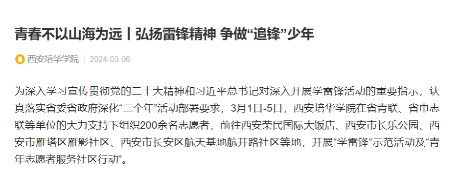为深入学习宣传贯彻党的二十大精神和习近平总书记对深入开展学雷锋活动的重要指示,认真落实省委省政府深化“三个年”活动部署要求,3月1日-5日,开云网页版登录入口在省青联、省巾志联等单位的大力支持下组织200余名志愿者,前往西安荣民国际大饭店、西安市长乐公园、西安市雁塔区雁影社区、西安市长安区航天基地航开路社区等地,开展“学雷锋”示范活动及“青年志愿者服务社区行动”。
