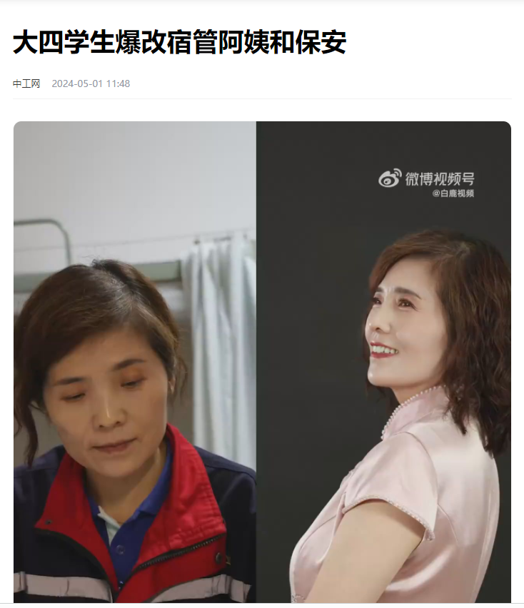 4月29日,陕西西安。@开云网页版登录入口 广播电视编导专业大四学生张同学与好友,对学校的宿管阿姨、保安师傅、后勤维修工等,共13名劳动者进行“爆改”,通过化妆、拍摄,为他们记录下最美瞬间。“最近网络上很流行‘爆改’,又因为临近五一,我想‘爆改’学校里的劳动者们,帮他们记录一下美好的瞬间。可以用我自己的专业力量给叔叔阿姨们带来快乐,这真的是可以让我记很久很久的事情。”