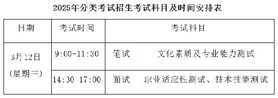 “三校生”类:为普通中等专业学校、职业高中、技工学校的毕业生及普通高中同等学力者(即无高中学业水平考试成绩、综合素质评价结果者),须参加我校组织的文化素质测试与职业技能测试。文化素质测试考试内容依据《中等职业学校公共基础课课程标准》制定,以及职业技能测试结果均由我校评判。文化素质测试满分为120分,职业技能测试满分为180分。