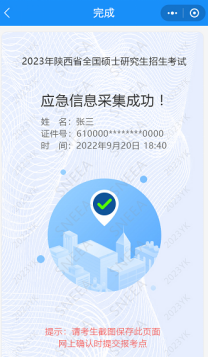 考生应急信息填报成功后进入“应急信息采集成功”界面。将此图截图保存提交给报考点。