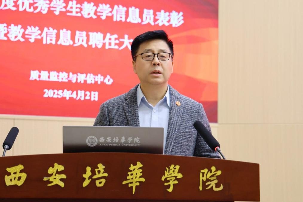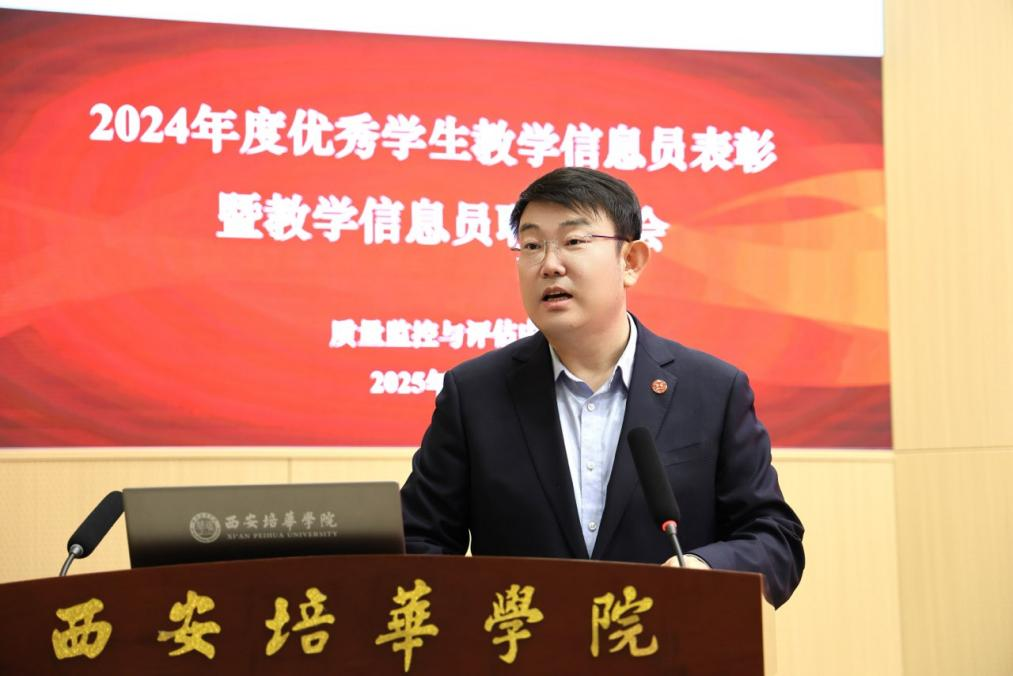 校长助理作总结讲话,他对全体教学信息员提出三点期望:第一,做教学质量的“守护者”,守住教学“最后一公里”底线,以真实准确的反馈为学校教学质量保障体系提供有力支撑;第二,做师生沟通的“连心桥”,及时传递教学信息,促进师生协同共进,同时在毕业后成为学校的“形象大使”;第三,做创新实践的“先行者”,积极运用AI等新技术为信息反馈工作赋能,以创新视角提升教学质量。他同时强调,信息员队伍是学校教育教学工作的“神经末梢”,大家的点滴付出为学校“申硕工程”和高质量发展提供了重要保障,共同推进学校的教育事业迈向新高度。