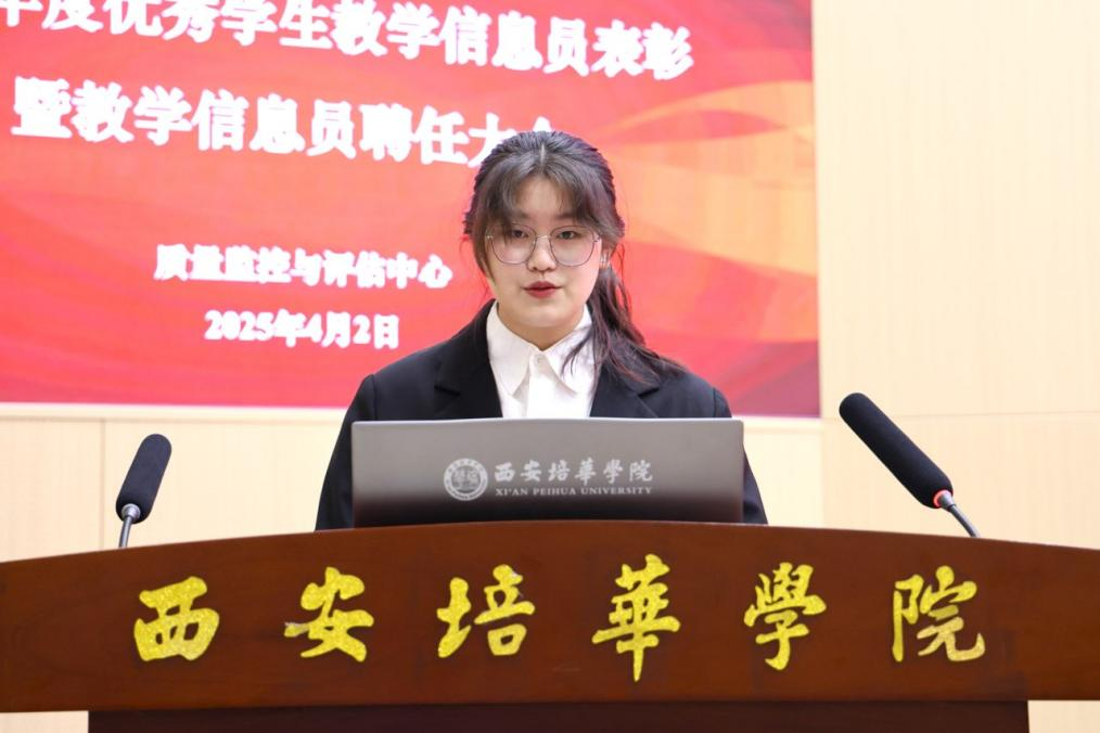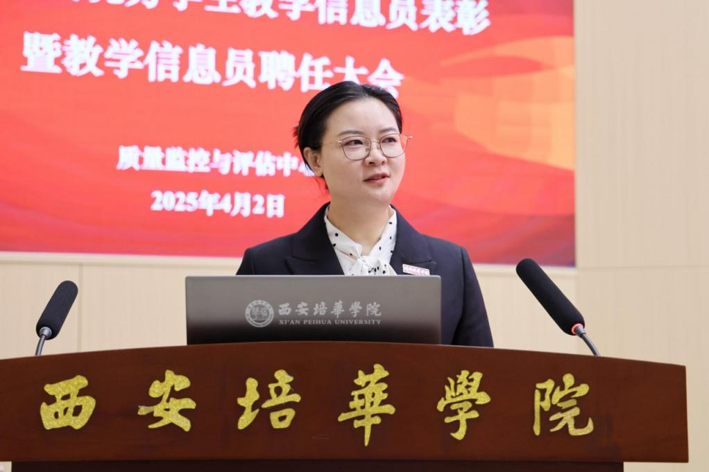 教育教学督导办公室主任王西娅讲话。她向受表彰的优秀学生教学信息员和新聘学生信息员表示祝贺,希望信息员在今后的工作中多关注产教融合相关教学信息,同时向学生教学信息员工作提出三个原则:一是坚持客观公正,广泛收集意见;二是确保信息准确详实,记录具体问题细节;三是规范反馈流程,通过指定渠道及时上报。她鼓励同学们消除顾虑、大胆建言,为提升教育教学质量、推动学校内涵发展贡献力量。