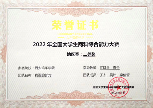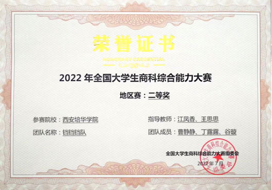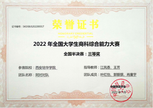 近日,由中国创造学会主办,同济大学经济与管理学院、上海策鸿信息科技有限公司、中国创造学会青年工作委员会承办的“2022年全国大学生商科综合能力大赛”圆满落幕。经过激烈角逐,在学校会计与金融学院江凤香、王芳、夏金、王思思老师的指导下,学校共有三支团队获奖。其中,叶红怡、郭银银、肖童宇同学所在团队获全国半决赛三等奖;丁杰、吴炜、李信哲同学,曹静静、丁露露、谷璇同学所在团队分别获得地区赛二等奖。